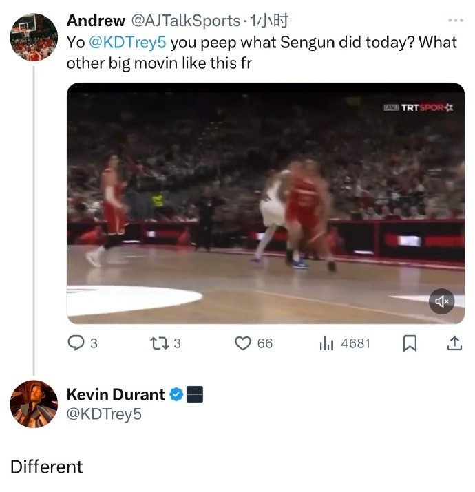 一位球迷转发申京本场丝滑回转 冲破 暴扣视频并喊话杜兰特:“哟KD,你看到申京今天的表现了吗?还有哪个大个子能像他这样移动啊,真的牛。”