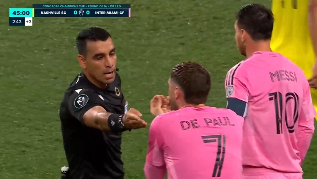 上半场补时,梅西连续控球后倒地,起身后梅西表示应该给牌。随后德保罗也非常不满。