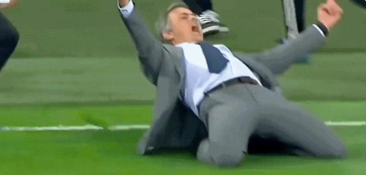 14年前,也就是2012年11月,皇马3-2致胜球 曼城,在C罗打进最后得分 后,穆里尼奥再度滑跪庆祝。