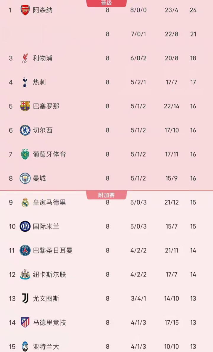 本轮其他赛事 也全是名场面,利物浦6-0血洗卡拉巴赫,曼城2-0轻取加拉塔萨雷,热刺2-0击败法兰克福,勒沃库森3-0完胜比利亚雷亚尔,各大强队纷纷发力。最终阿森纳、巴萨、利物浦、热刺、曼城、切尔西、葡萄牙体育、勒沃库森锁定8个直通名额,其中英超球队就占了5席,妥妥的本轮最大赢家。