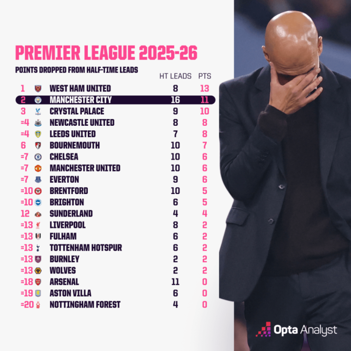 本赛季英超职业联赛 中,曼城在半场领跑 的情况下丢掉了11分——只有深陷降级区的西汉姆联队在这种情况下丢分更多(13分)。