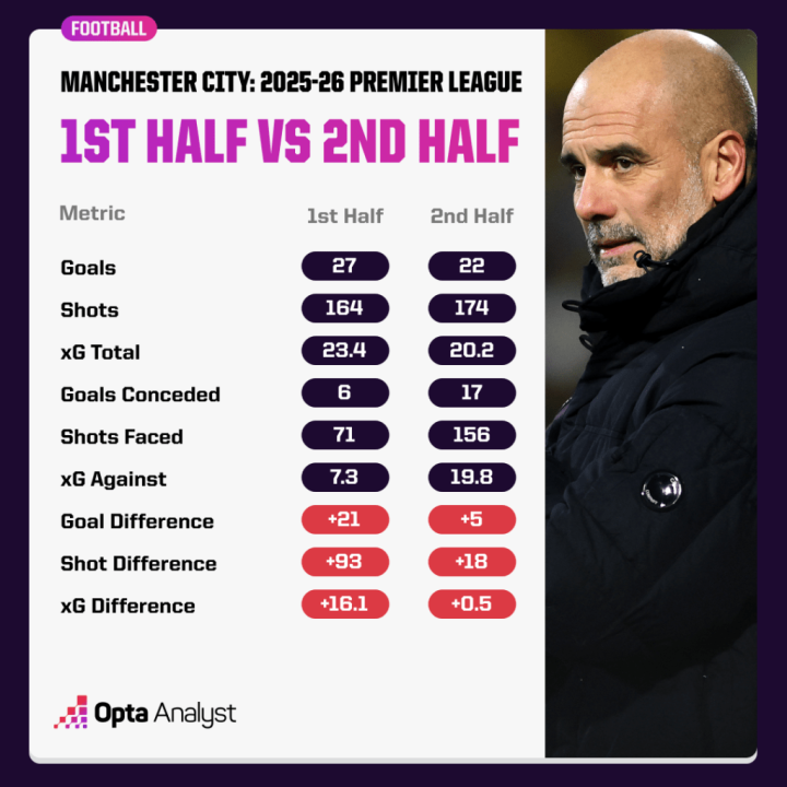 当然,部分原因在于赛事 形势——别忘了,曼城在24场赛事 中有16场半场领跑 ——但他们上下半场的得分 数、射球 数和预期得分 数的差异相当令人担忧。