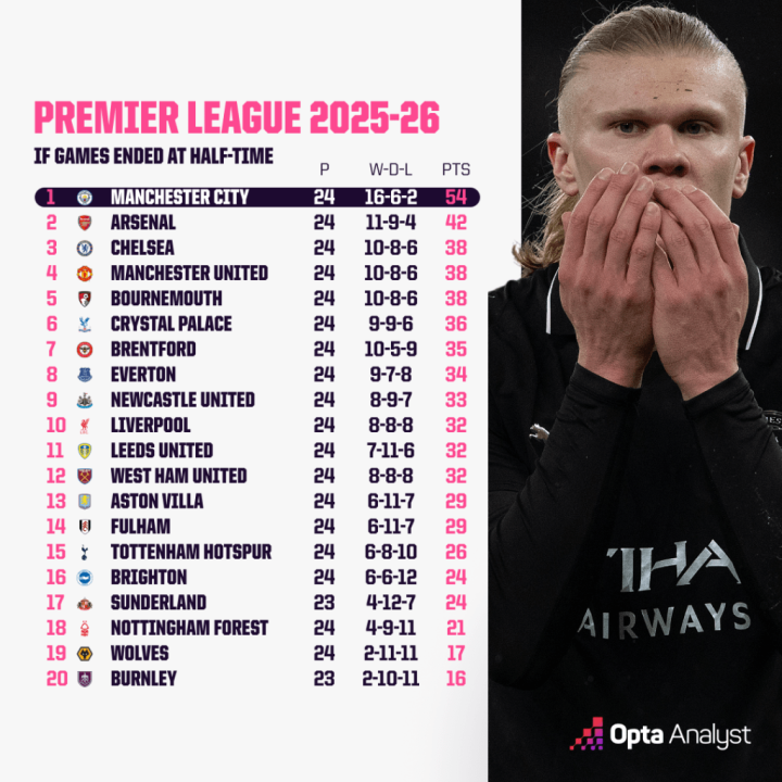 曼城目前在英超第一名 争夺战中追赶 枪手6分,这很大程度上是由于他们在赛事 下半场丢分造成的。相比之下,阿森纳在2025-26赛季的11场赛事 中,只要上半场领跑 ,就未丢一分。同样,本赛季也对第一名 发起强劲冲击的阿斯顿维拉,在6场上半场领跑 的赛事 中也未丢分。