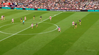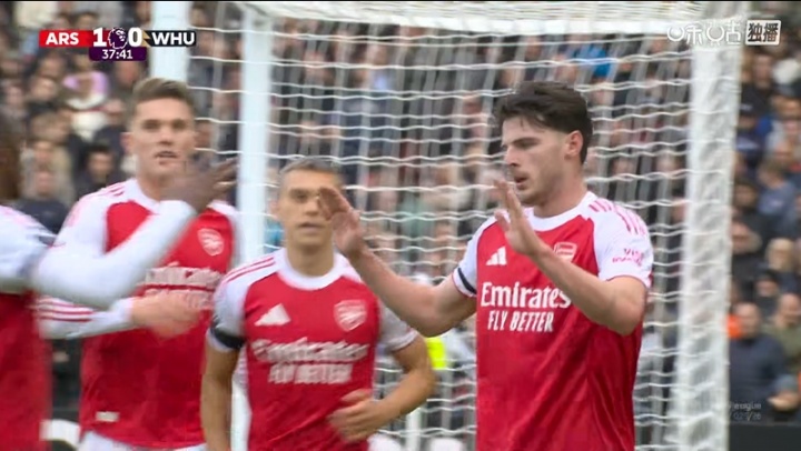10月04日讯 英超第7轮,阿森纳vs西汉姆联。赛事 第38分钟,英超直播赖斯补射攻破旧主大门,阿森纳1-0领跑 !得分 后赖斯没有庆祝。