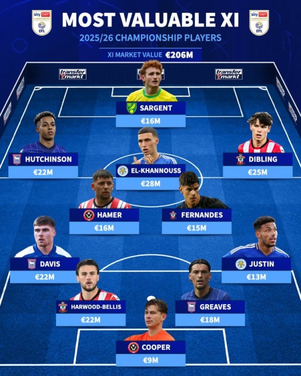 英超超积分榜 8月8日讯 新赛季英冠今夜开打,德转列出了截至目前职业联赛 最贵11人阵,迪布林、哈钦森、埃尔哈努斯、贝利斯在列,11人总身价2.06亿欧。 德转列英冠身价最贵阵: 守门员:迈克尔-库珀(谢菲尔德联,900万欧) 后场球员:雷伊夫-戴维斯(伊普斯维奇,2200万欧)、贝利斯(南安普顿,2200万欧)、雅各布-格里夫斯(伊普斯维奇,1800万欧)、詹姆斯-贾斯汀(莱斯特城,1300万欧) 中场球员:哈默(谢菲尔德联,1600万欧)、埃尔哈努斯(莱斯特城,2800万......