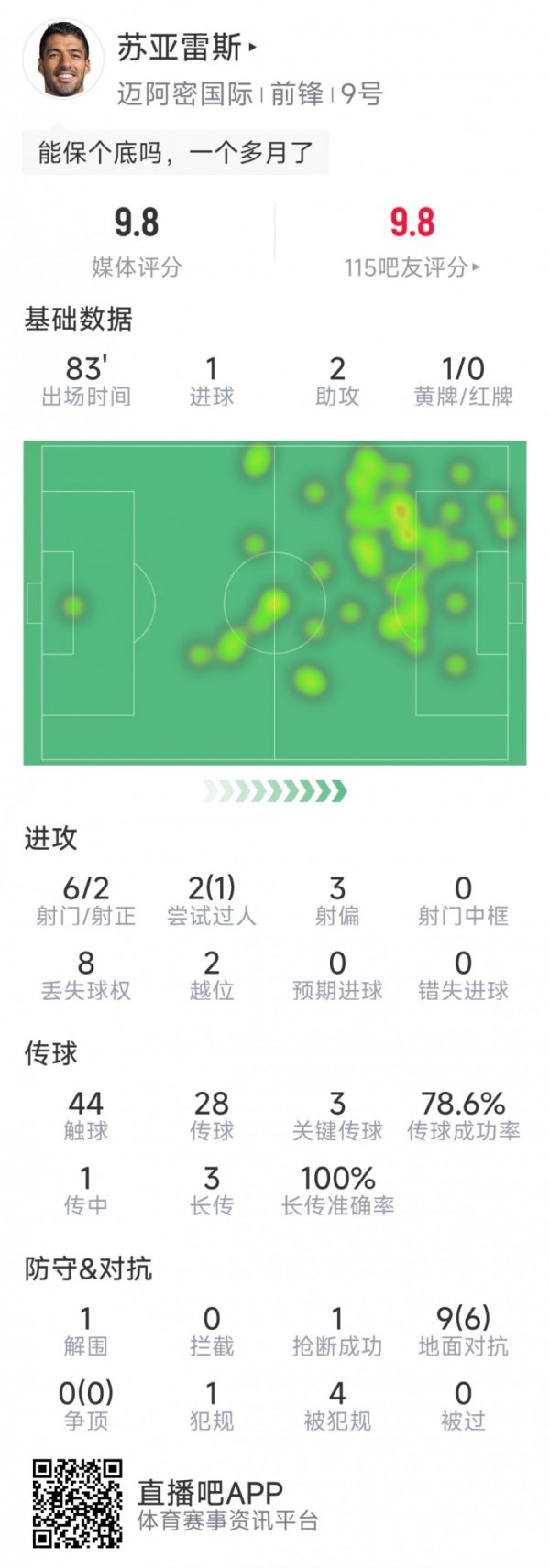 英超最新战报积分榜 8月7日讯 在联盟杯小组赛迈阿密国际对阵墨西哥美洲狮的赛事 中,苏亚雷斯杆位出战表现出色,以下为他在本场数据: 赛事 时间83分钟 1粒得分 2次助功 6次射球 2次射正 2次过人1次成功 44次触球 3次关键传送球 传送球 成功率78.6% 1次解围 1次抄截 9次对峙 6次成功 评分9.8分 英超最新战报积分榜......