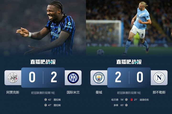 其中唯一赢球的国米2-0击败阿贾克斯。输球的两场分别是亚特兰大0-4大败 巴黎,那不勒斯0-2不敌曼城。打平的赛事 则是尤文4-4多特,英超免费高清直播斑马军团补时轰入2球,上演绝平。