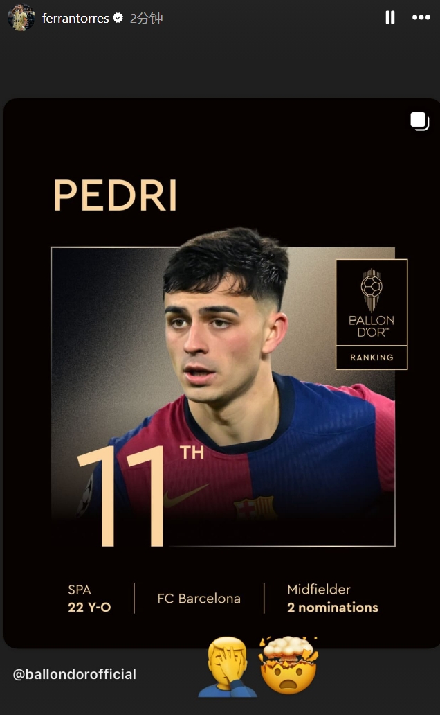 佩德里仅获金球第11名!费兰-托雷斯社媒发表情:🤦♂️🤯