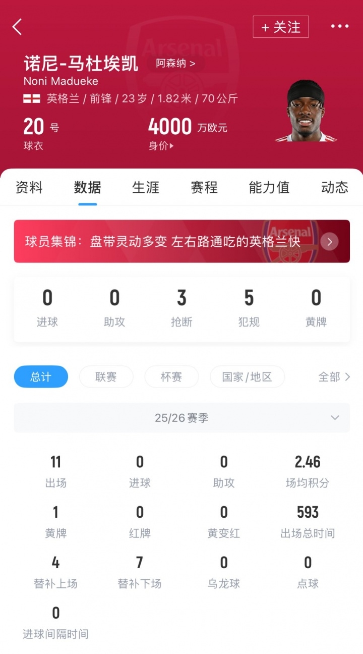上轮英超阿森纳1-1战平曼城的赛事 中,马杜埃凯杆位半场被萨卡换下。