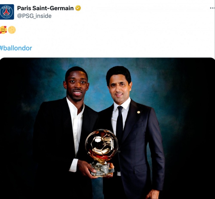 巴黎荣誉 时刻!巴黎社媒:登贝莱手持金球与纳赛尔合影🥰🌕